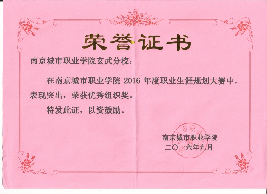 2016年度南京城市职业学院职业生涯规划优秀组织奖