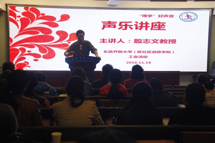 为丰富广大教职工的业余文化生活,缓解教师的工作压力,促进教职工身心健康发展,营造积极健康向上的校园文化氛围,多宝官方网站在11月18日下午2:00在207多功能教室举办了“博学”好声音教职工声乐讲座,本次讲座邀请南京艺术学院殷志文教授为老师们主讲。
