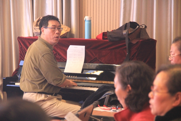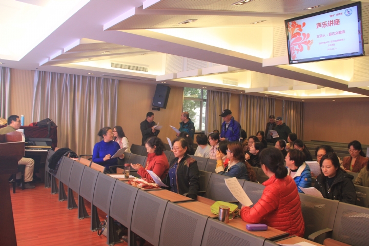 殷教授分别从声乐的发声、声乐的诀窍、声乐艺术表现的影响因素以及声乐的连断问题这四方面对声乐表演的艺术表现力进行了系统阐述,耐心细致地回答了老师们提出的种种疑问。同时还选择《中华谣》和《我和我的祖国》两首歌曲进行现场教学,与老师们共同欢唱。