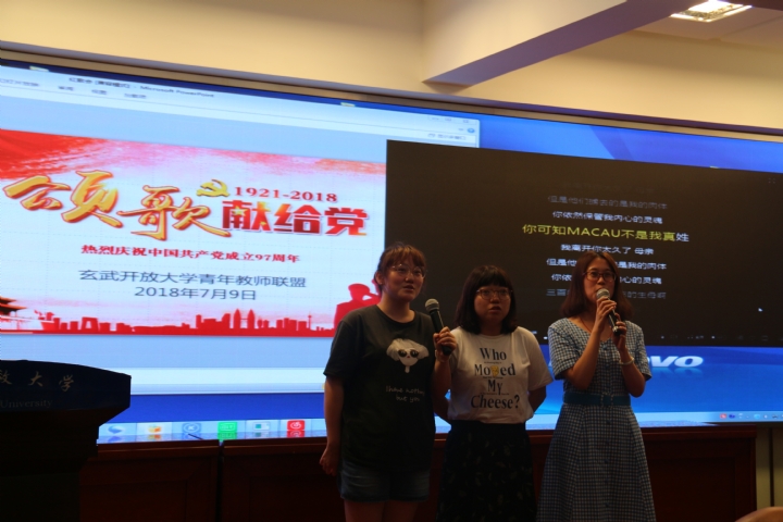 活动在校办张然主任“太阳最红,毛主席最亲”的歌声中拉开序幕。歌声一阵赛过一阵,将现场气氛一度推向高潮。在《军港之夜》、《国家》、《没有共产党就没有新中国》、《团结就是力量》、《众人划桨开大船》、《红星闪闪》、《七子之歌》等歌党、颂党革命歌曲的吟唱中,全体青年教师以饱满的激情歌颂党的丰功伟绩,表现了青年教师的良好精神面貌和高昂的工作热情,大家把对祖国的祝愿、对党的忠诚、对学校美好未来的憧憬,都寄托在歌声中。