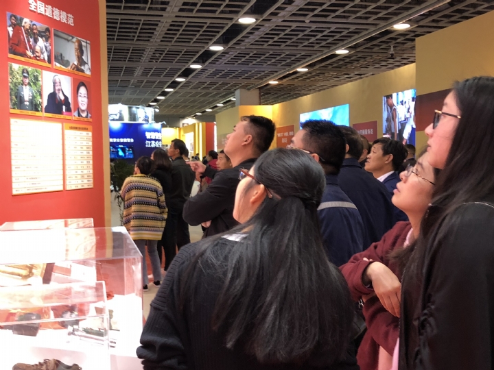 此次参展内容是对我校青年教师的触动积极深刻,共鸣强烈。青年教师是伴随改革开放成长起来的一代人,见证改革开放变化的一代人。通过一张张照片、一面面展墙,一个个熟悉的“物件”,青年教师们一边重温成长的记忆,一边学习未知的新事物,感叹着今朝的辛福生活来之不易,胸怀江苏人满满的自豪感。改革开放40年江苏先进模范人物的集中展示,校长助理李青老师为大家介绍其中已逝任务的辉煌事迹,更是让老师们得到精神洗礼。大家纷纷拍照留念,记录分享一个个精彩瞬间。