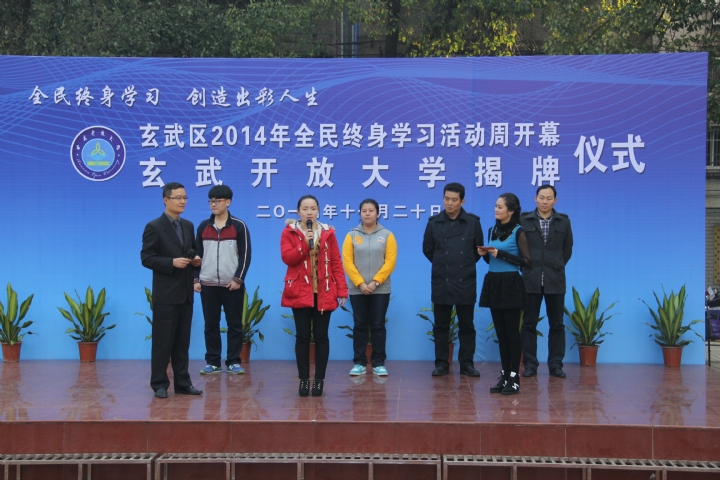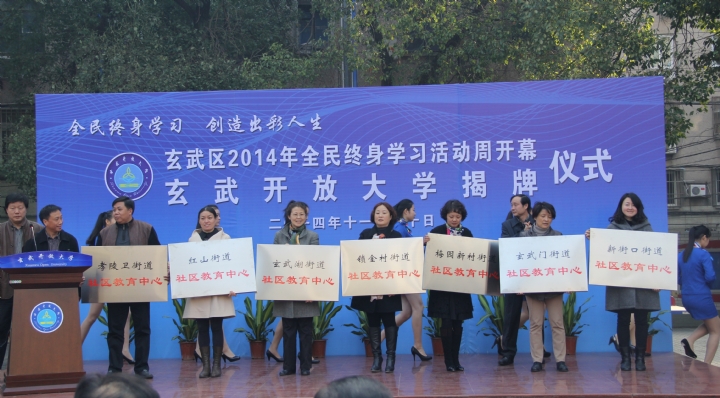 11月20日下午,玄武区在多宝官方网站举办了2014年全民终身学习活动周开幕暨多宝官方网站揭牌仪式,南京市教育局副局长潘东标、职业教育与社会教育处调研员王广礼、南京开放大学校长夏桂松、副校长秦怀建、玄武区人民政府副区长蒋兆全、区教育局局长李玉鹏、副局长戴继根、全区各街道分管书记、社会资源单位(联合办学单位、社区教育共同体单位)代表、社区居民代表以及多宝官方网站师生代表共600多人参加了仪式活动。