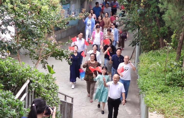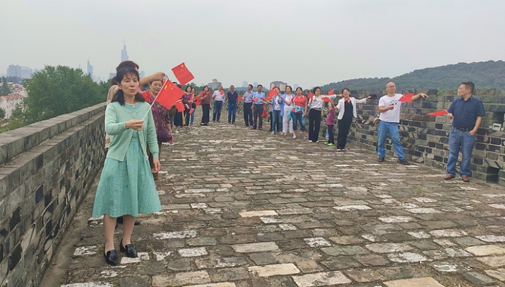 我校党支部开展了“登城墙喜迎国庆,唱祖国美好明天”主题党日活动。在庆祝新中国成立70周年的喜庆氛围中,我校党员登上了富贵山隧道东侧的城墙,欣赏了南京东郊的风景,感叹祖国的大好河山,激发了大家的爱国热情。回来后,在多功能教室,大家一致认为应该用“不忘初心、牢记使命”主题教育激发出的爱国热情、工作热情和进取精神转化到推动学校高质量发展中去,转化到在平凡的岗位上为祖国献上一份力的决心中去。最后,在沈青主任的带领下,大家一起高歌《我和我的祖国》,在深情的歌声中结束了今天的活动。