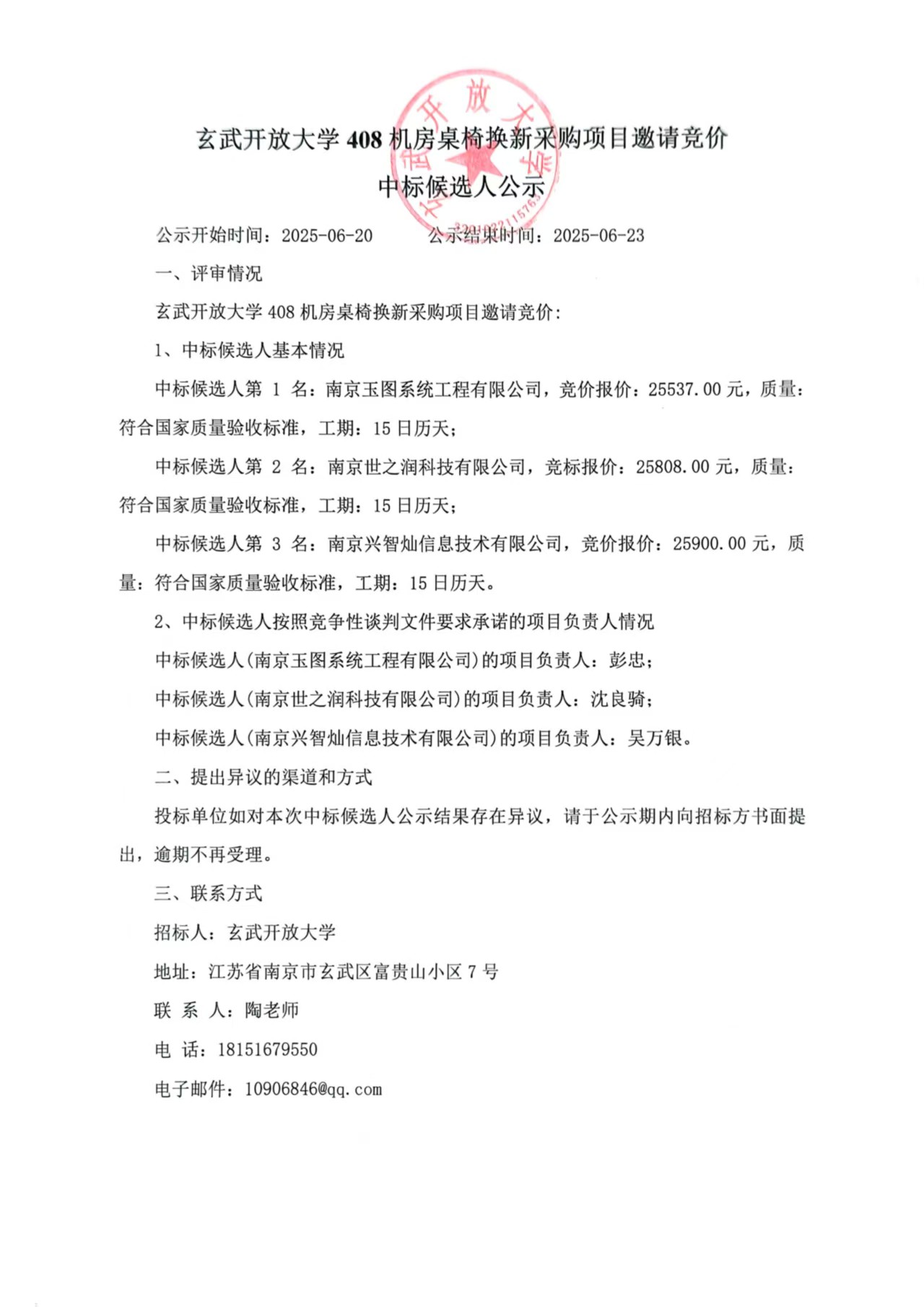 多宝官方网站408机房桌椅换新采购项目邀请竞价中标候选人公示