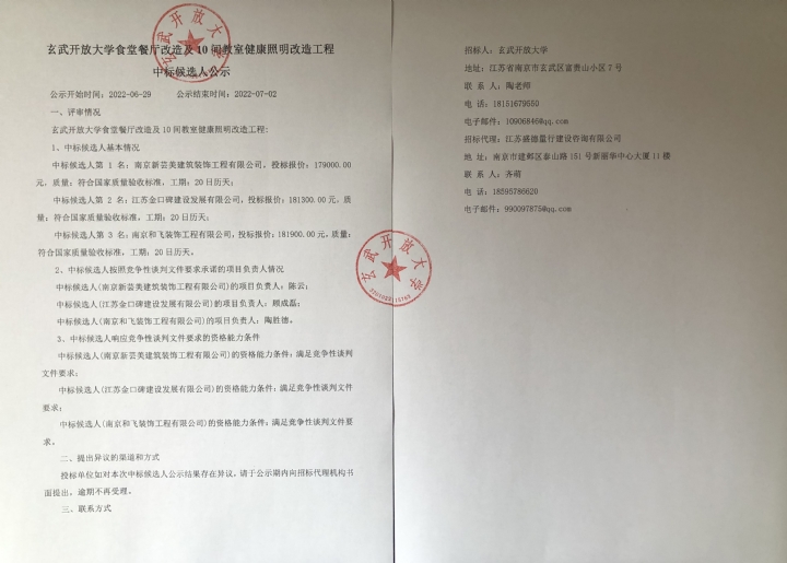 多宝官方网站食堂餐厅改造及10间教室健康照明改造工程 中标候选人公示