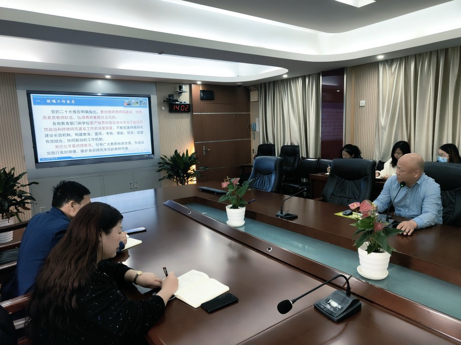 首先张校长带大家学习了党的二十大报告中关于师德师风建设工作的要求,要加强师德师风建设,培养高素质教师队伍,弘扬尊师重教社会风气;接着他通报了近日教育部公开曝光第十二批7起违反教师职业行为十项准则的典型案例,以案说法,要求广大教职员工树立底线意识,始终保持严的标准;最后张校长号召大家争做“四有”好老师,弘扬斯霞老师的“童心母爱”精神,传承“爱的教育”。